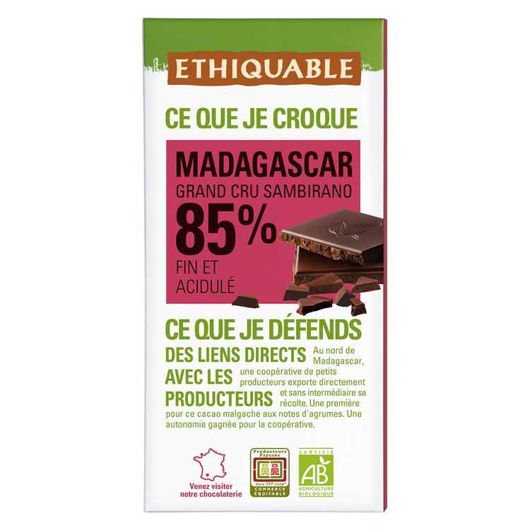 CE QUE JE CROQUE : La vallée du Sambirano offre un cacao Trinitario rare avec des notes d’agrumes typiques. Une teneur en cacao à 85% est capable de mettre en valeur ces fins arômes acidulés, sans amertume.