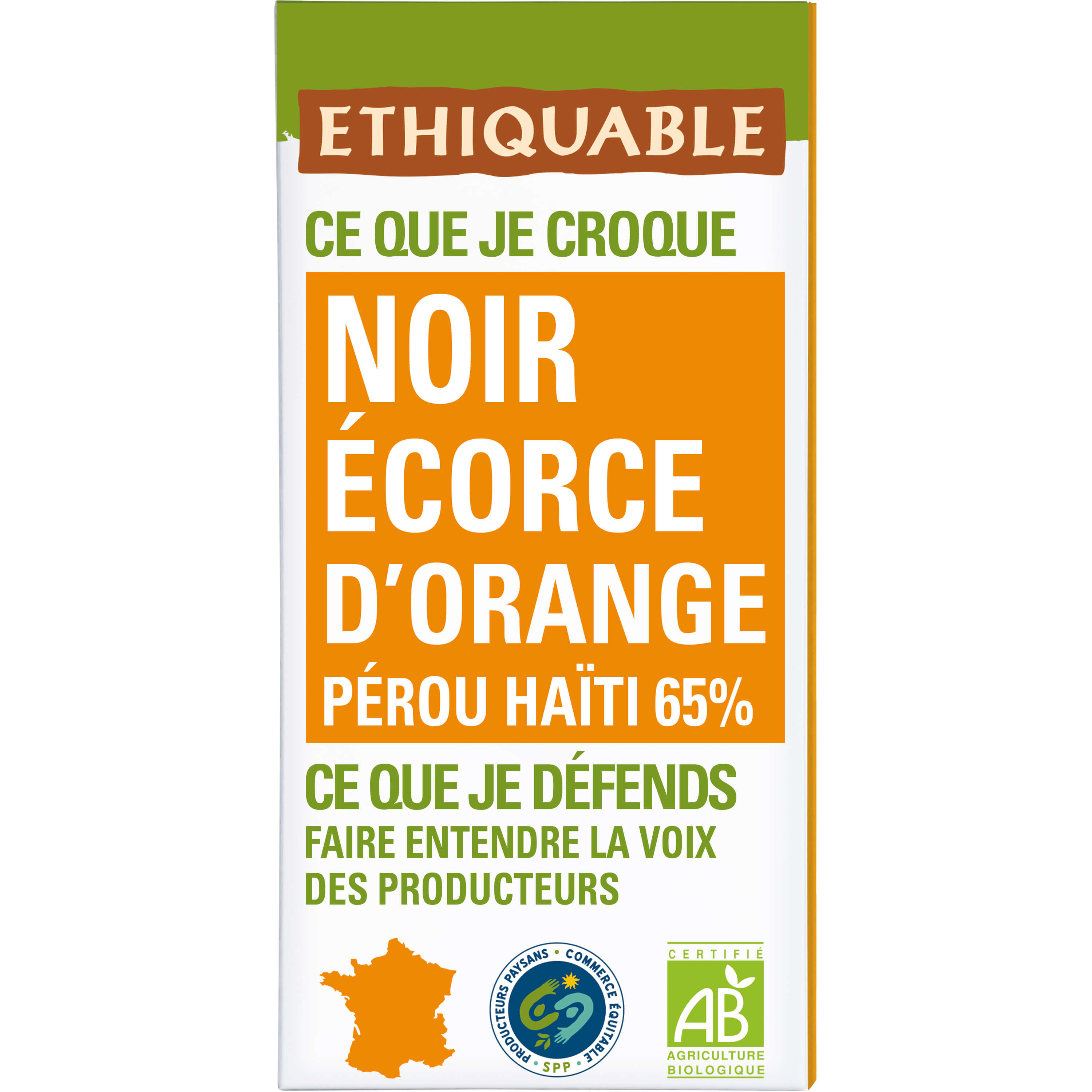 Tablette de chocolat noir bio écorce d'orange Pérou Haïti 65% cacao