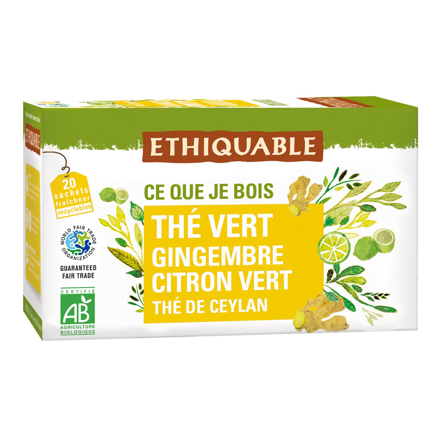 ingrédients issus du commerce équitable certifiés Fairtrade/Max Havelaar : thé vert, gingembre (83% du poids total)