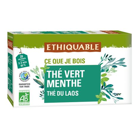 CE QUE JE BOIS : Un traditionnel thé vert menthe version équitable et bio, particulièrement soigné avec un thé vert Shan et des feuilles de la très aromatique menthe de variété Nana.