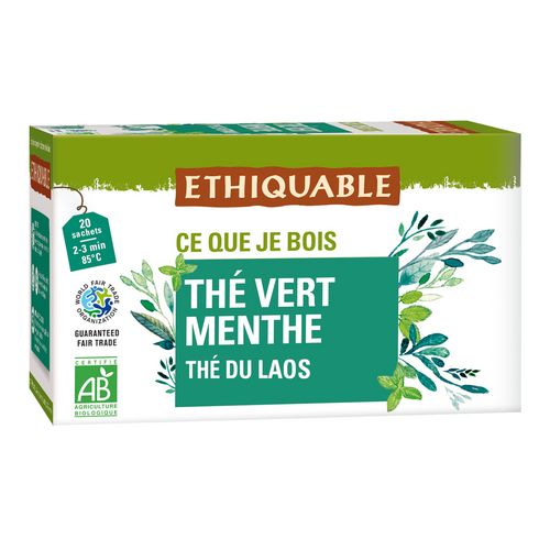 ingrédients issus du commerce équitable certifiés Fairtrade / Max Havelaar: thé vert, menthe (100% du poids total)