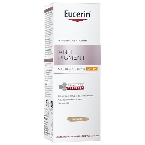 Le Soin de Jour teinté Medium SPF30 Anti-Pigment couvre et réduit efficacement les taches brunes pour un teint à l'apparence naturelle et immédiatement unifiée.