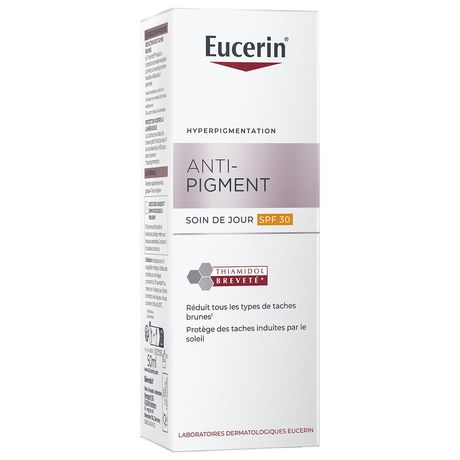 Eucerin ANTI-PIGMENT Soin de Jour SPF 30 contient du Thiamidol, un ingrédient efficace et breveté qui agit à la base de l'hyperpigmentation en réduisant la production de mélanine. Il est prouvé par des études cliniques et dermatologiques qu'il réduit les taches brunes et empêche leur réapparition. Les premiers résultats sont visibles après deux semaines et s'améliorent continuellement avec une utilisation régulière.