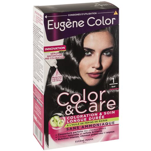 Le 1er rituel de coloration soin en 3 étapes sans ammoniaque L’association d’un sérum protecteur cheveux et cuir chevelu à des crème colorantes sans ammoniaque pour une couleur naturelle sublimée de beaux reflets brillants et une couverture parfaite des cheveux blancs tout en douceur. Eugène color color & care N° 1 noir.