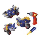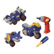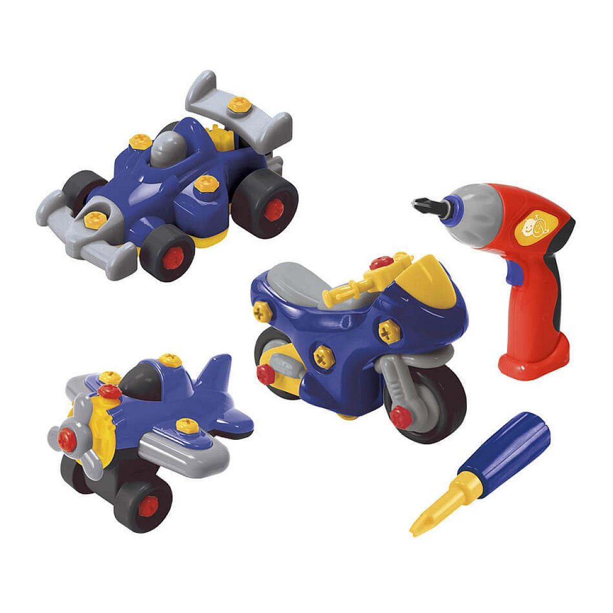 Construisez vos propres véhicules et roulez-les où vous voulez. Ce coffret de 61 pièces comprend une visseuse électrique et une visseuse manuelle et vous permettra de construire 3 véhicules différents : une voiture de course, une moto et un avion. Vous pouvez les monter et les démonter autant de fois que vous le souhaitez ! Ce jeu offre des heures de plaisir éducatif et entraîne la motricité fine, la pensée logique et l'imagination des enfants. Cela les aide également à apprendre à connaître les différentes pièces qui composent un véhicule et comment ses différents composants s'assemblent. Âge : A partir de 3 ans.