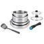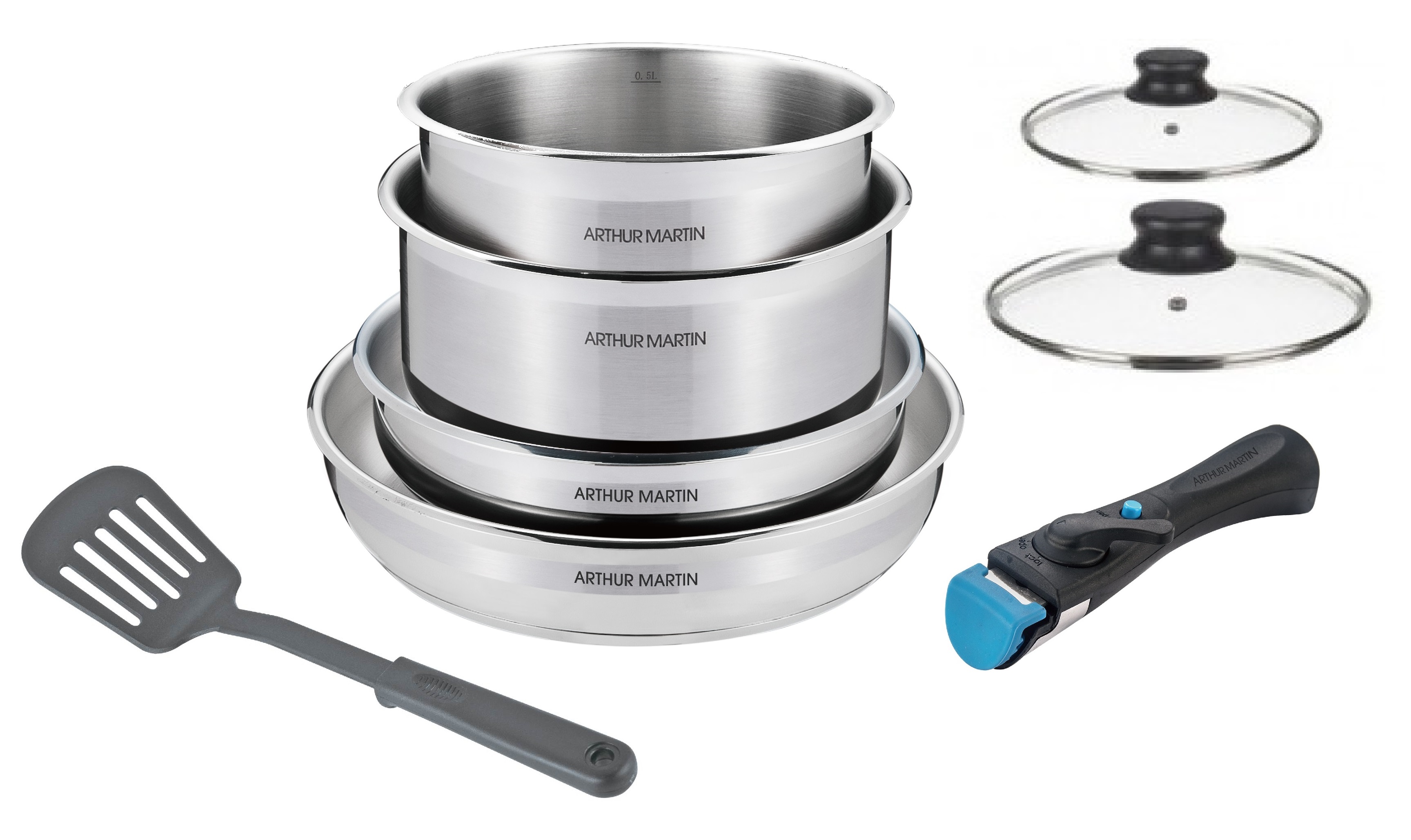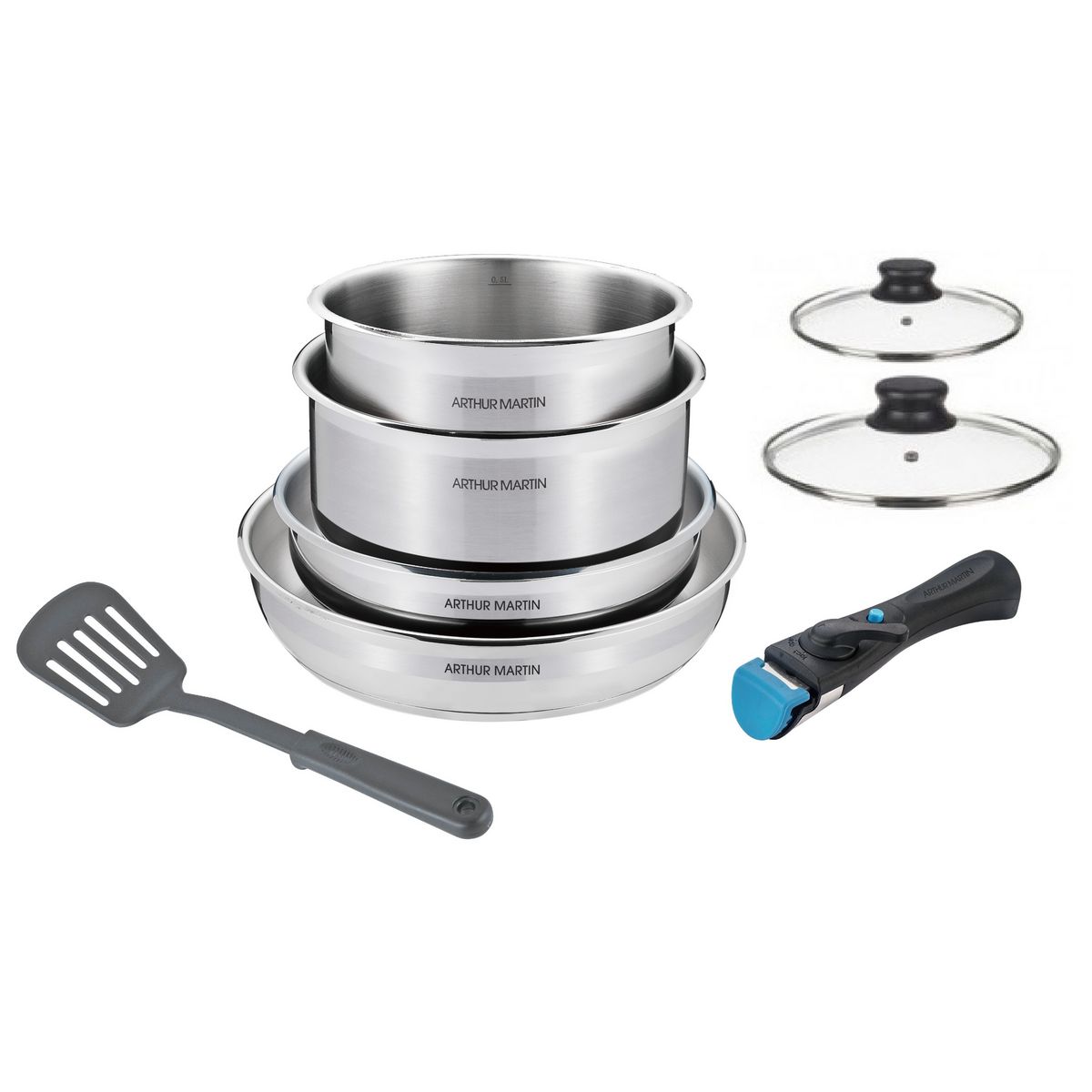 2 poêles 24-26 cm - 2 casserole 14-18 cm - 2 couvercle en verre 14-18 cm - 1 ustensile en nylon - 1 poignée Matière : acier inoxydable Revêtement intérieur mat inox Revêtement extérieur inox brillant Poignée amovible Tous feux dont induction