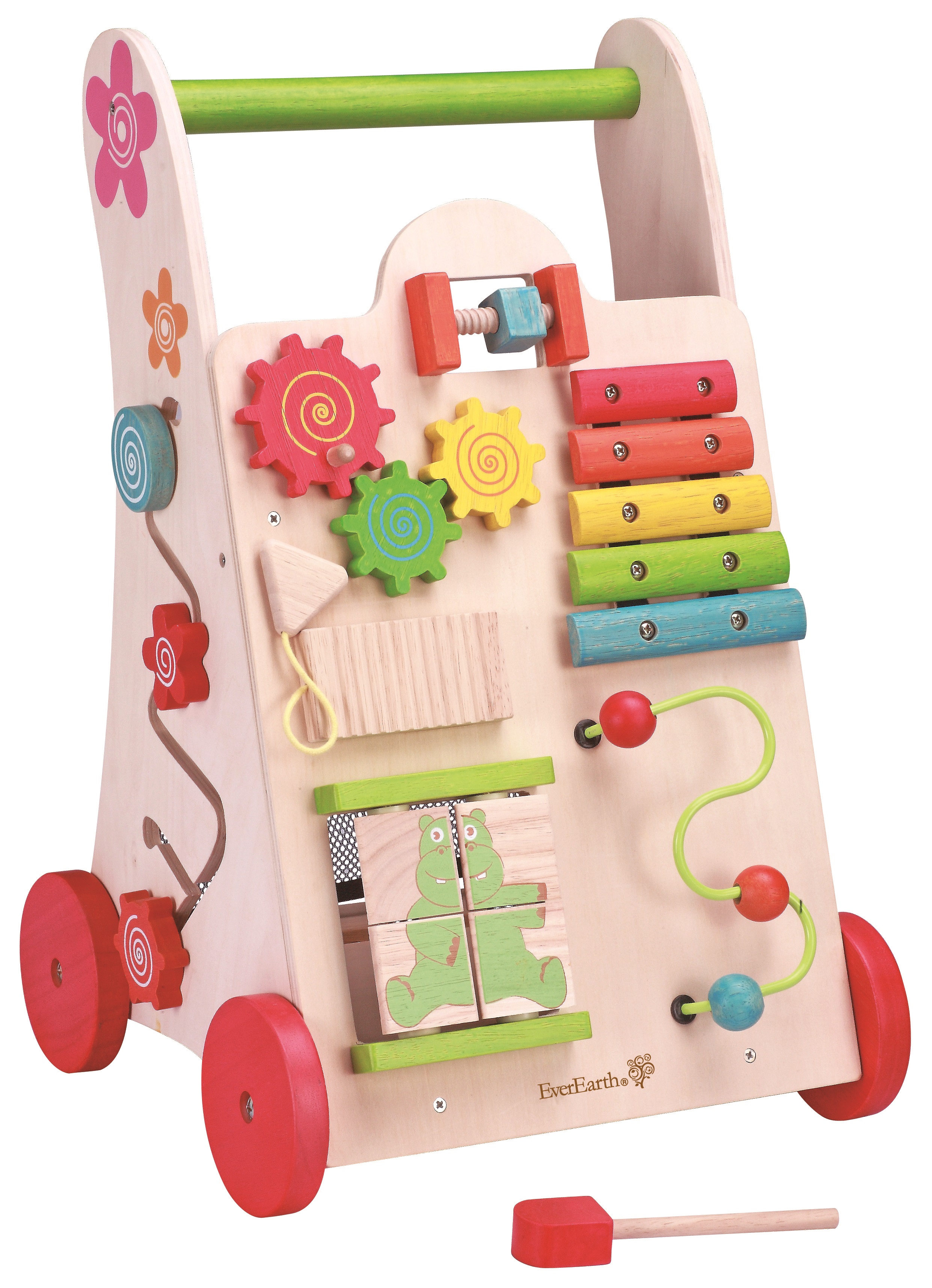 Un petit puzzle d'animaux, un boulier, un xylophone, un labyrinthe de fleurs colorées et différentes possibilités d'assembler des cubes en bois sur le côté amuseront votre enfant lors de l'apprentissage de la marche.