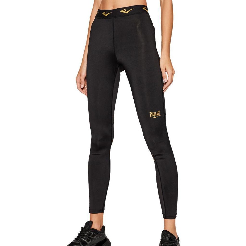 Legging pour femme de la marque Everlast ! Couleur : Noir, Doré Coupe ajustée Tille haute Ceinture élastique Bas arrière du legging transparent Imprimé Everlast Composition : 90% polyester, 10% élasthanne