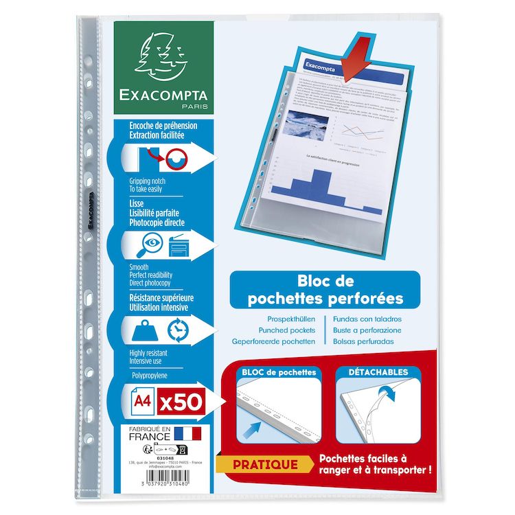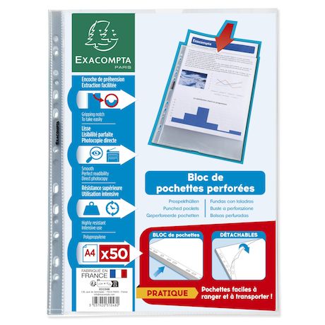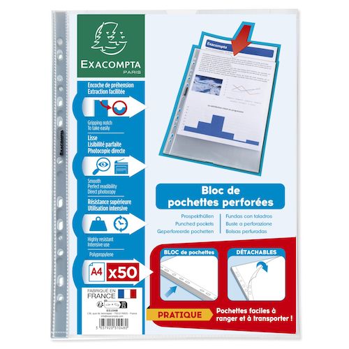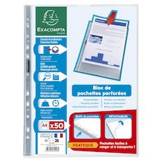 Bloc de 50 pochettes perforées en plastique transparentes lisses A4