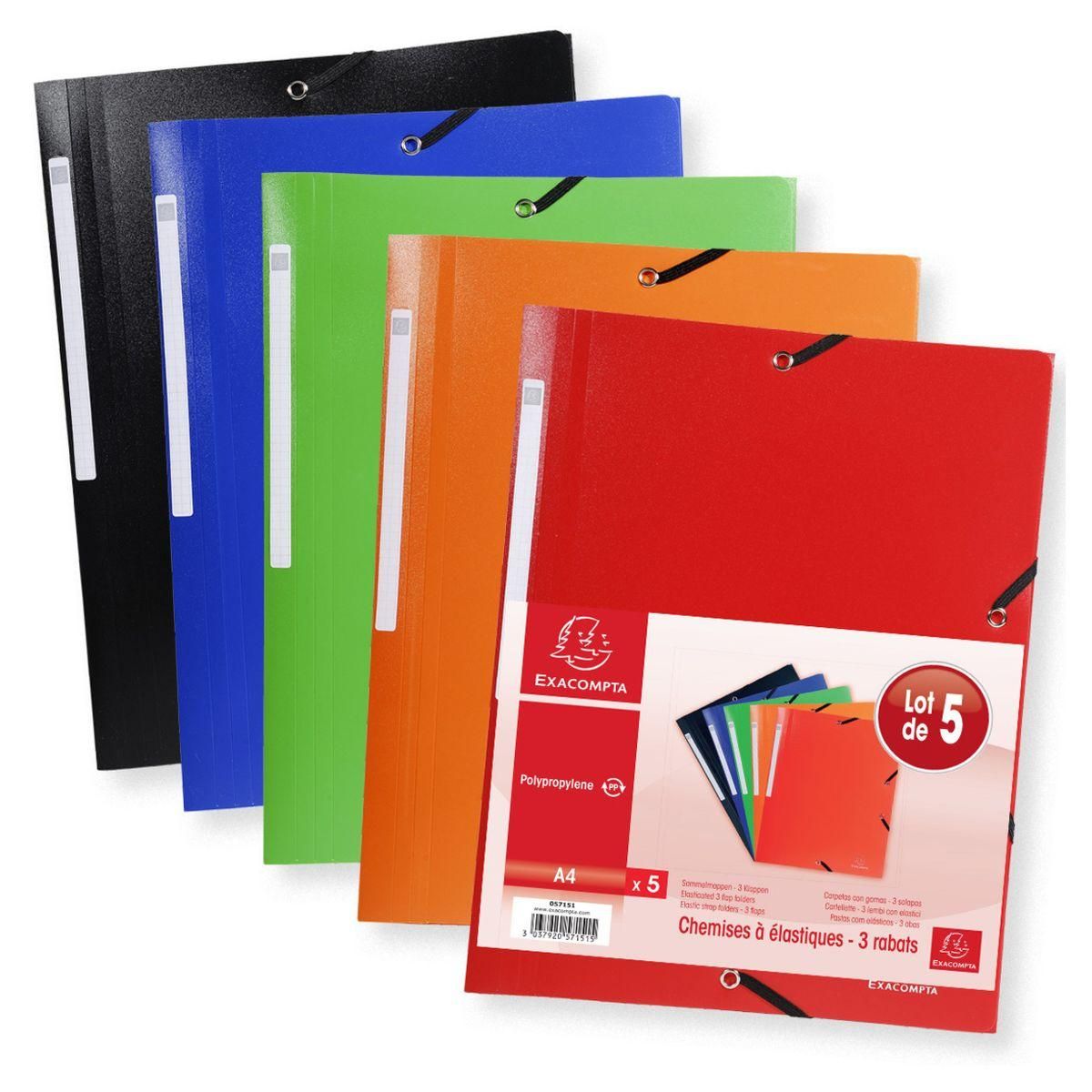 Lot de 5 chemises à élastiques 24x32cm 3 rabats polypro coloris assortis
