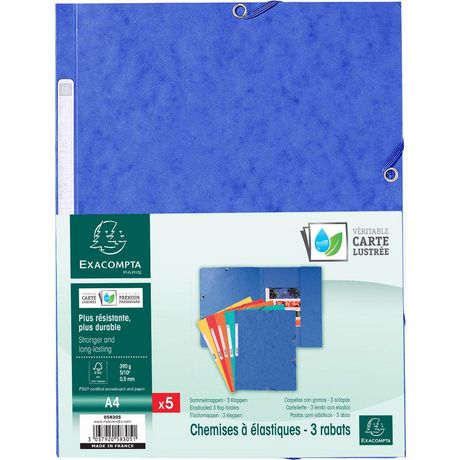 Chemise 3 rabats en carte lustrée haute qualité et écologique, certifiée FSC®. Avec étiquette de dos pour identifier les dossiers. Convient pour des documents A4. Fermeture par élastique.