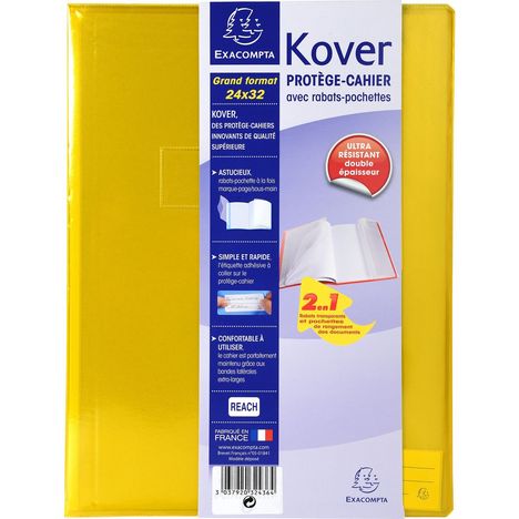 Le Kover est le seul protège-cahier équipé de rabats pochettes. Les rabats permettent de repérer les pages. Les pochettes aident à classer proprement des feuilles volantes. Qualité supérieure : PVC double épaisseur (220 microns), conforme à la directive de l'Union Européenne REACH. Bandes latérales