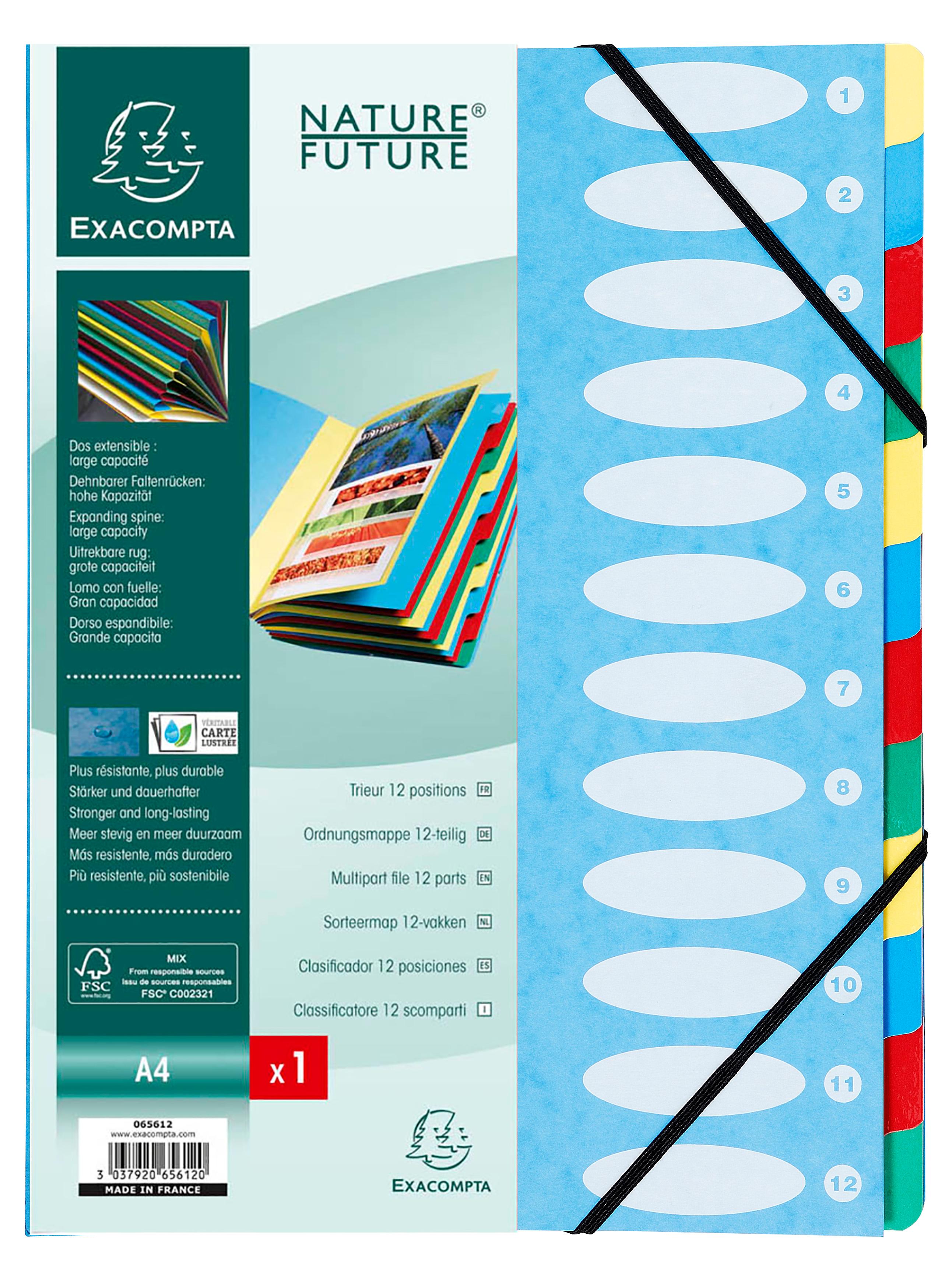 En savoir +Trieur 12 positions. Dos à soufflets extensible. Élastiques pour refermer le trieur. Carte lustrée pour une meilleure résistance.