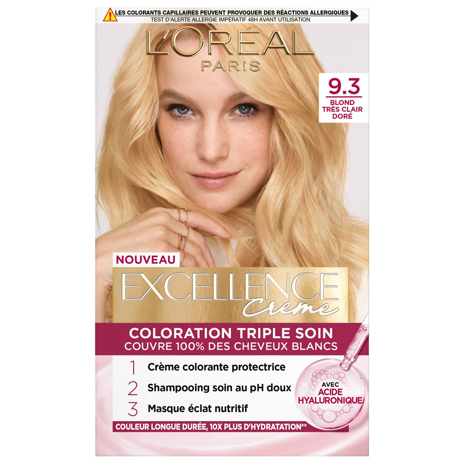 Excellence Crème de L'Oréal Paris, enrichi en acide hyaluronique* pour 10X plus d’hydratation** et une couleur riche longue durée. Obtenez une qualité de cheveux visiblement meilleure que sans coloration. Couvre 100% des cheveux blancs*** pour tous les types de cheveux. *Shampooing et masque enrichis en acide hyaluronique **Test instrumental après utilisation du masque nutritif ***Test instrumental Le Kit contient une crème colorante protectrice, un shampooing soin au pH doux et un masque éclat nutritif. Si vous hésitez entre deux nuances, choisissez la teinte la plus clair. Si vous avez les cheveux longs, utilisez deux kits de coloration. Conseil entre deux colorations, camouflez vos racines avec Magic Retouch. Votre couleur est riche et homogène, vos cheveux souples et brillants.