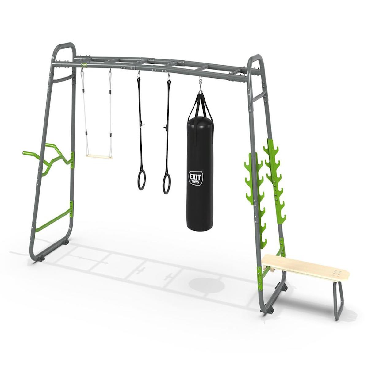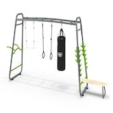 L'EXIT GetSet MB330, une structure extérieure polyvalente, vous propose une gamme complète d'accessoires pour vos entraînements en plein air. Conçue pour les adolescents de plus de 14 ans et les adultes sportifs, cette installation de près de cinq mètres offre une multitude de possibilités pour relever des défis et améliorer votre condition physique.