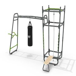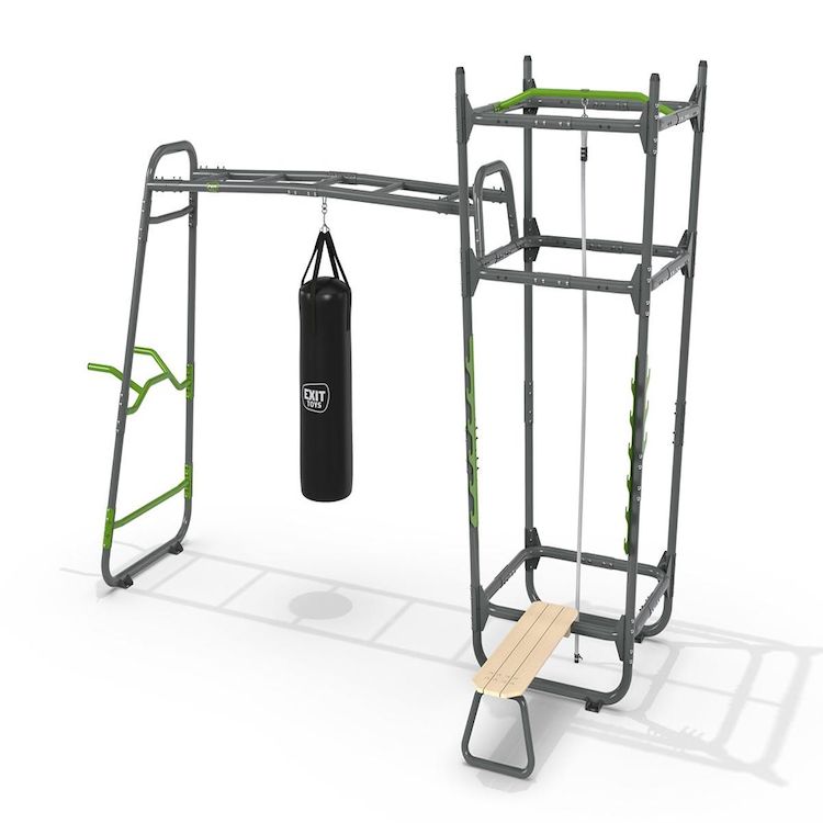 L'EXIT GetSet PS510 est une powerstation d'extérieur de plus de quatre mètres, comprenant une variété d'accessoires tels que barre push-up, barre à dips, anneaux de battle rope, sac de frappe, banc de musculation, chandelles porte-haltères, barre de traction et corde à grimper. Conçue pour offrir suffisamment de défis pour les jeunes de plus de 14 ans et les adultes sportifs.