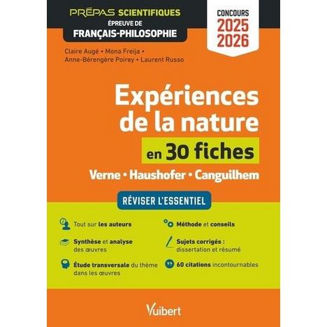 L'ouvrage indispensable pour réviser le thème et faire la différence. Tout sur les auteurs : Pour connaître leur biographie et le contexte dans lequel ils ont écrit leurs oeuvres. Synthese et analyse des oeuvres : Pour maîtriser les oeuvres au programme et savoir s'y référer dans tes dissertations. Etude transversale du thème : Pour aborder le thème Expériences de la nature sous tous les angles grâce à une analyse comparative des oeuvres. Méthode et conseils : Pour acquérir les techniques indispensables de la dissertation et du résumé. Sujets corrigés : Pour s'entraîner, dans les conditions du jour J, aux épreuves de dissertation et de résumé avec des corrigés entièrement rédigés.