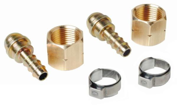 2 tétines pour tuyau, 2 écrous et 2 colliers de serrage.