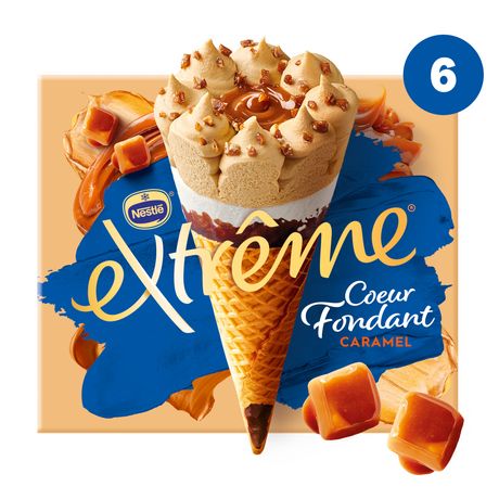Succombez à l’ultra gourmandise du cône CŒUR FONDANT- CARAMEL d’Extrême. Découvrez son cœur Fondant - CARAMEL au sein de deux glaces onctueuses Caramel et Saveur Crème, le tout parsemé de morceaux de nougatine caramélisés, dans une gaufrette croustillante et pour finir, le délicieux bonbon EXTRÊME.