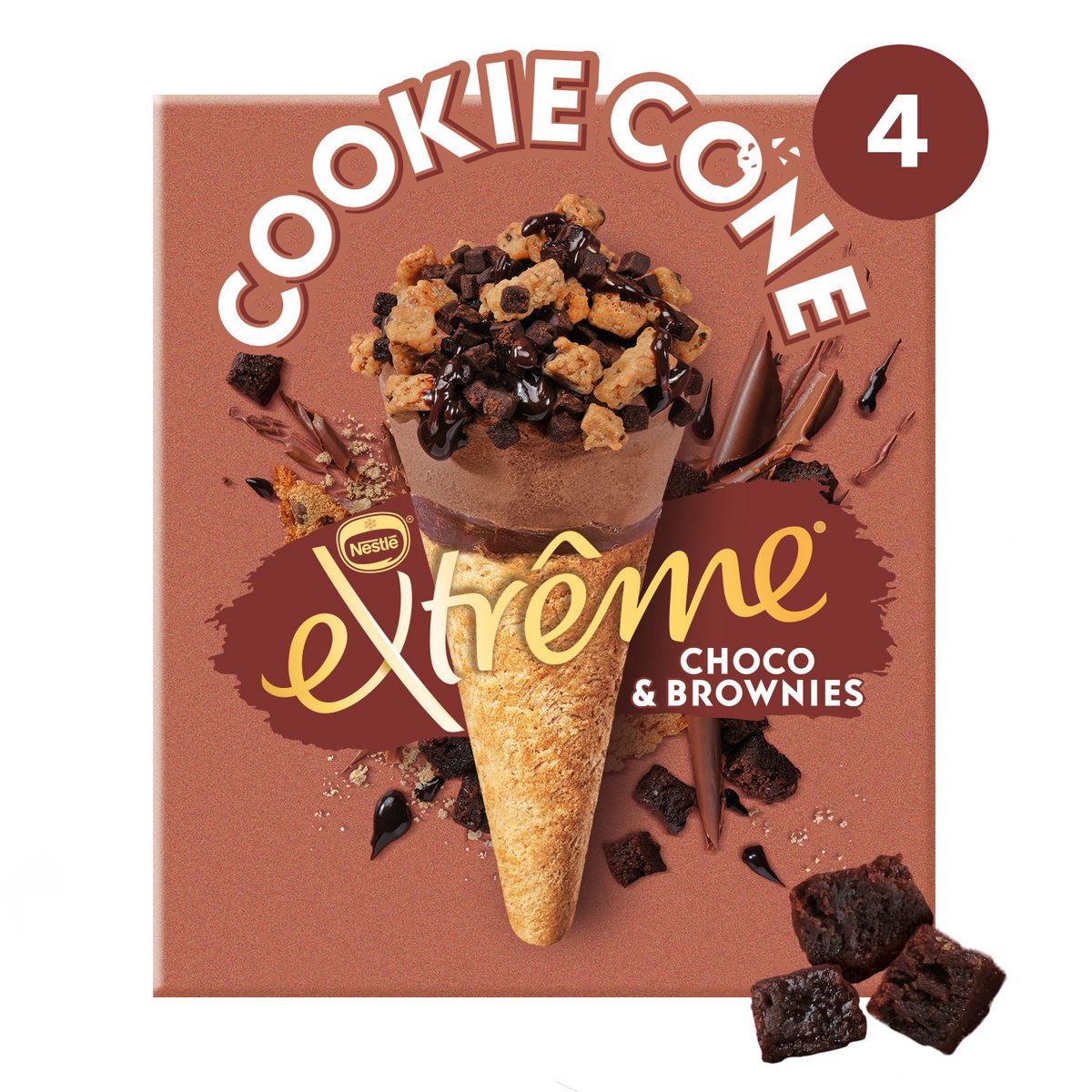Toute la gourmandise d'un cône fait d'un délicieux cookie, avec une glace onctueuse au chocolat, une sauce au chocolat et des généreux morceaux de Brownies et Cookie. Extrême jusqu'au bout.