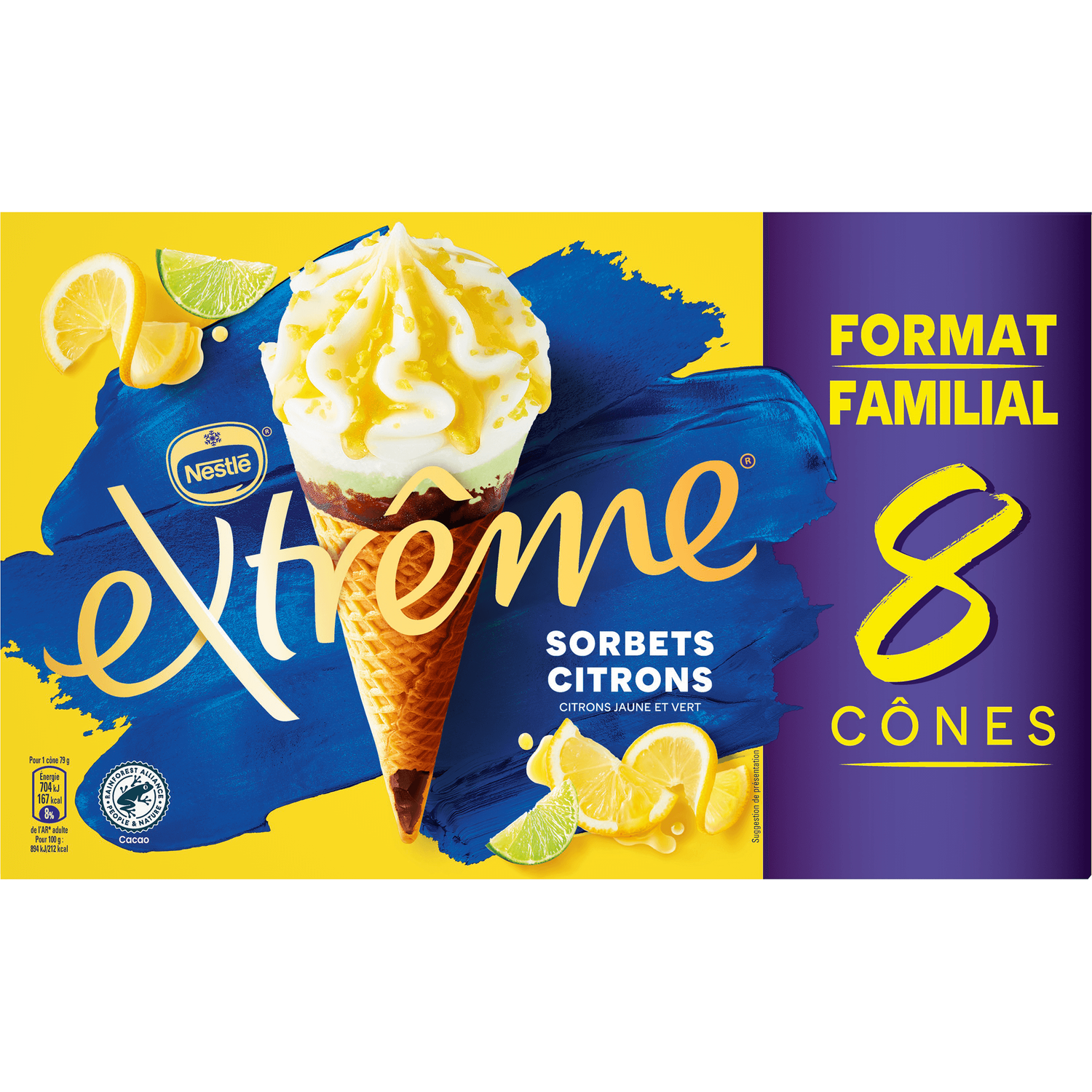 Gaufrette garnie de sorbets au citron et au citron vert, sauce au citron (10%) et pépites au citron (2.5%)