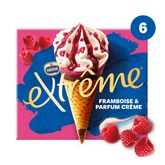 Toute la gourmandise et la fraicheur de deux glaces Parfums Framboise et crème, avec des pépites de framboise sur le dessus et une sauce fruits rouges, dans une gaufrette croustillante, sans oublier le délicieux bonbon Extrême.
