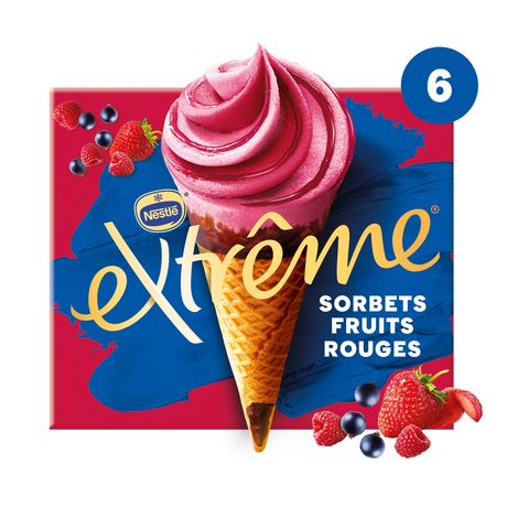 Succombez aux plaisirs fruités d'un sorbet fruits rouges et à l'intensité d'une sauce aux fruits rouges alliés à la fraîcheur d'un sorbet cassis et d'un sorbet fraise, le tout dans une gaufrette croustillante et pour finir, le délicieux bonbon EXTREME.