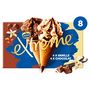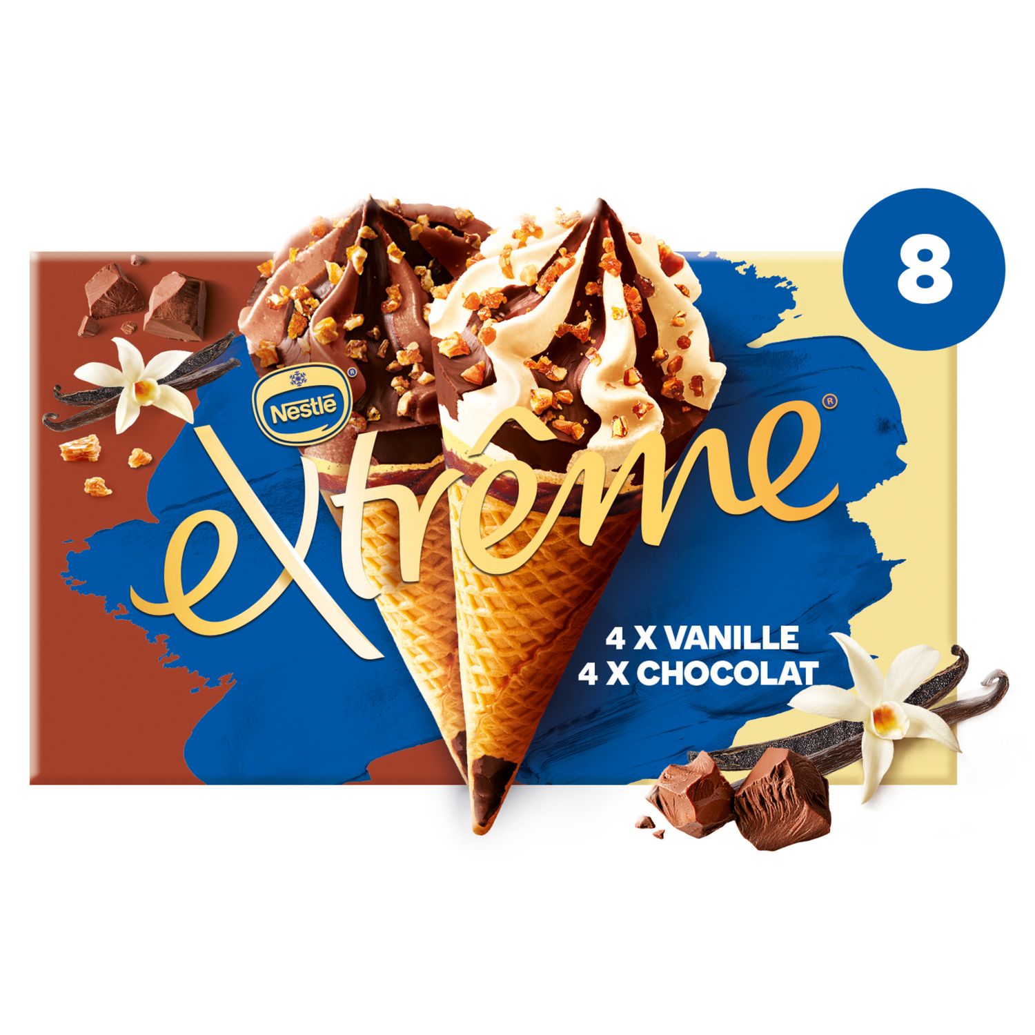 Le mix gourmand vanille et vanille/chocolat. Vanille: l'alliance incontournable d'une glace vanille onctueuse et d'une glace vanille points de gousses intense avec des pépites de nougatine croquantes. Vanille/Chocolat: l'alliance de glaces vanille et glace chocolat avec un croquant au cacao une sauce au chocolat et des pépites de nougatine croquantes. Le tout dans une gaufrette croustillante et pour finir, le délicieux bonbon EXTREME.