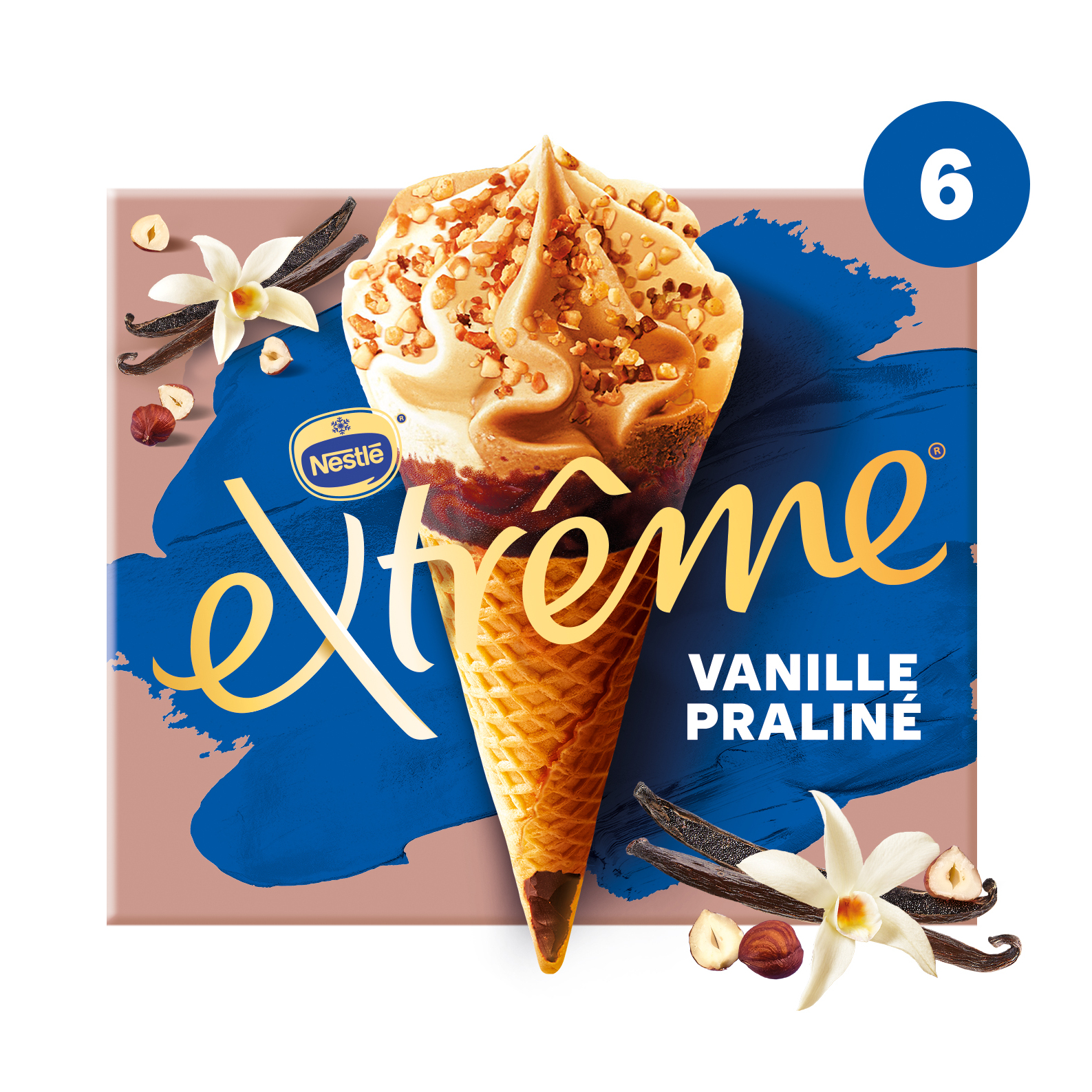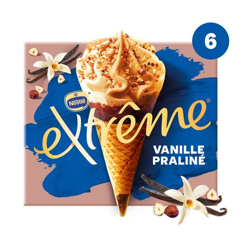 Laissez-vous emporter par l'alliance d'une glace vanille onctueuse et d'une glace praliné fondante associée à des pépites de praliné et à un cœur fondant de pâte de praliné, le tout dans une gaufrette croustillante et pour finir, le délicieux bonbon EXTREME.