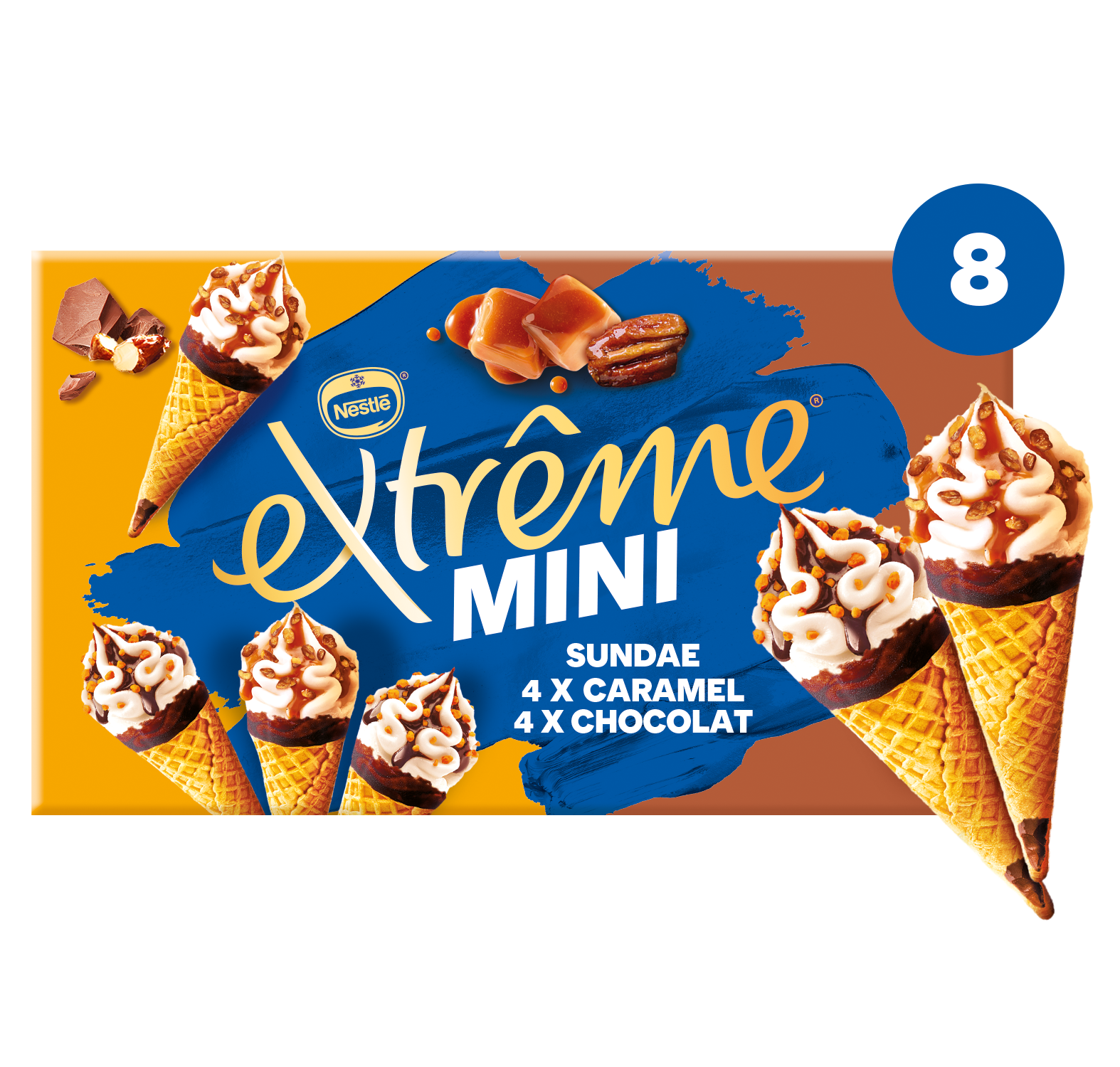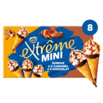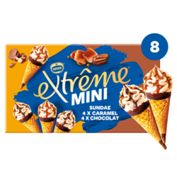 Tout le plaisir des Sundae en format mini. Sundae chocolat : l'alliance d'une glace parfum crème avec une sauce au chocolat et des morceaux d'amandes caramélisées. Sundae caramel : l'alliance d'une glace parfum crème avec une sauce au caramel et des morceaux de noix de pécan caramélisées. Le tout dans une gaufrette croustillante avec le délicieux bonbon EXTREME.