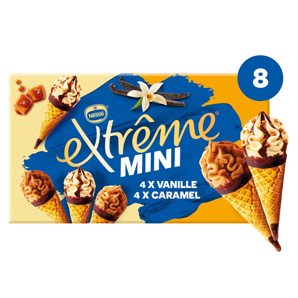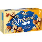 Tout le plaisir des cônes Extrême en format mini.Caramel : l'alliance d'une glace caramel avec une sauce et des morceaux au caramel beurre salé. Vanille : l'alliance d'une glace vanille avec une garniture au cacao et des pépites de nougatine. Le tout dans une gaufrette croustillante avec le délicieux bonbon EXTREME.