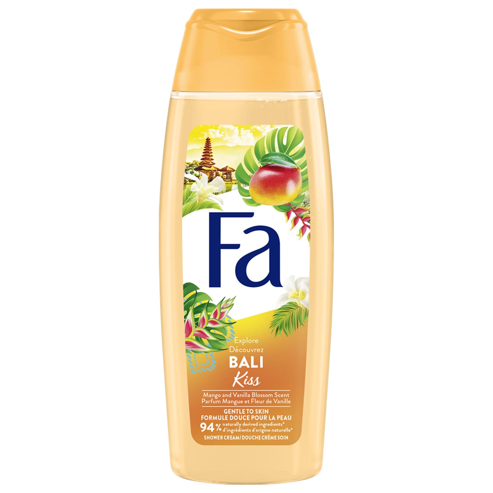 Osez voyager avec Fa ! Avec la crème douche soin Fa Bali Kiss, faîtes voyager vos sens et plongez dans l'univers exotique de son parfum MANGUE & FLEUR DE VANILLE.