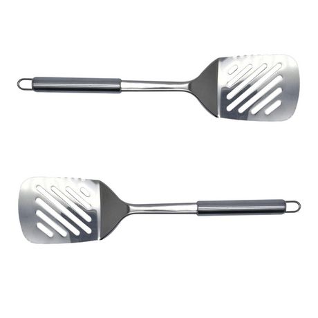 Ce lot de 2 spatules de cuisine ajourées en inox de 33 cm, signées Fackelmann, est l'ustensile idéal pour tous vos repas. Conçues en 100% acier inoxydable, elles garantissent une grande résistance et durabilité. Grâce à leurs fentes, ces spatules vous permettent de servir vos plats tout en les égout
