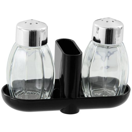 Ce set de cuisine comprend un support en plastique noir avec une salière et une poivrière. Entre la salière et la poivrière, il y a un espace dans lequel vous pouvez mettre des cure-dents, des sauces en sachets ou autre. Ce set pour sel et poivre est parfait à poser sur votre table de repas afin que chacun puisse assaisonner son plat comme il le souhaite.
