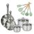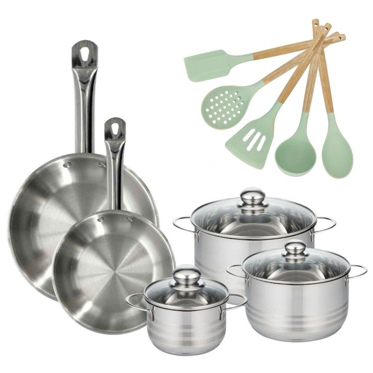 - COMPOSITION : Faitouts en acier inoxydable de haute qualité, poêles inox 18/8, et ustensiles en silicone et bois, offrant robustesse et durabilité.