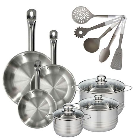 - DESCRIPTION : DESCRIPTION : Ce lot Fackelmann propose une solution complète pour la cuisine quotidienne avec 3 poêles en inox Eterna et 3 faitouts en inox, garantissant une cuisson homogène et économique.