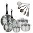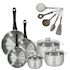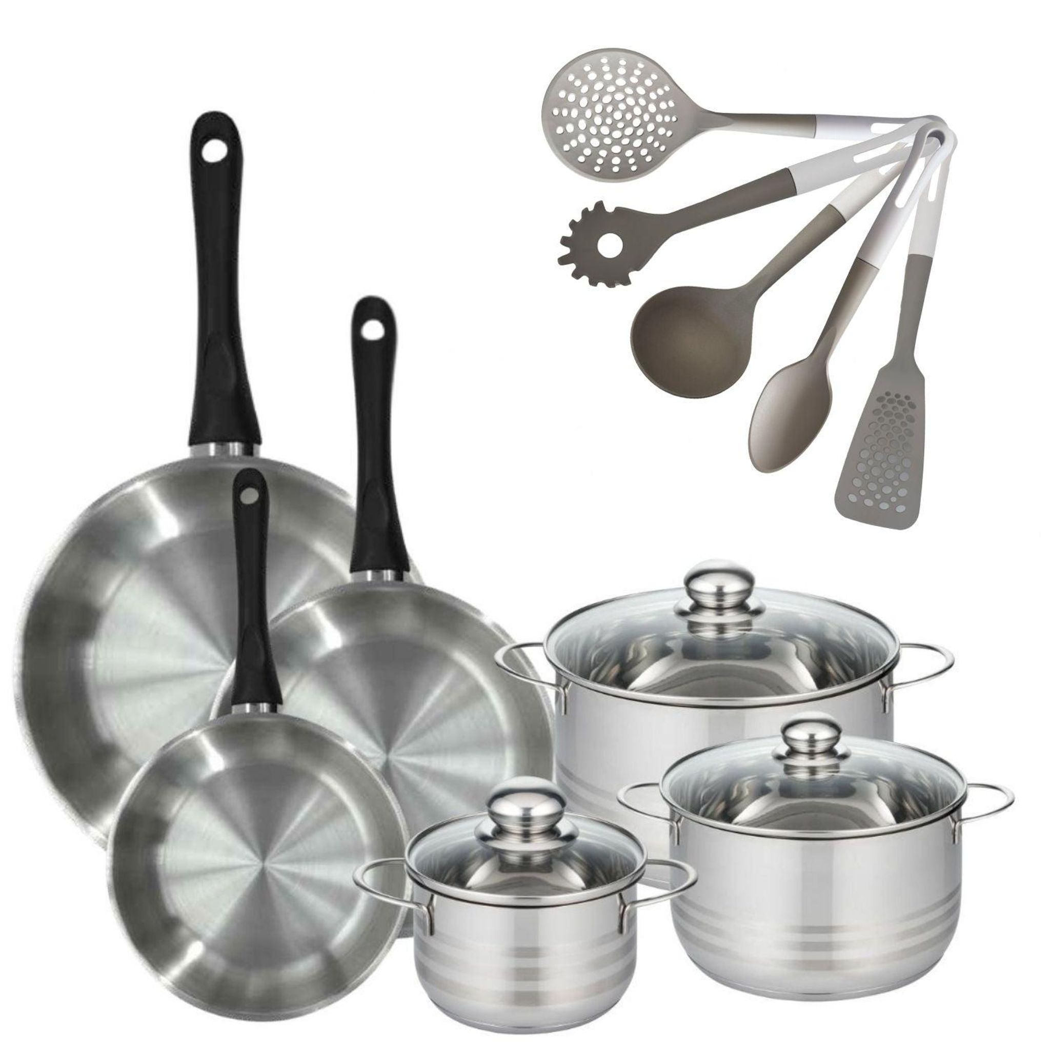 Lot 3 Poêles Inox 20/24/28cm Fackelmann Geneva & 3 Faitouts 16/20/24cm avec 5 Ustensiles Fackelmann