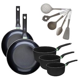 Lot de 2 Poêles 28/30 cm et 3 Casseroles 16/18/20 cm Fackelmann Brandao avec 5 ustensiles de cuisine