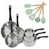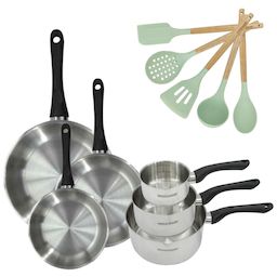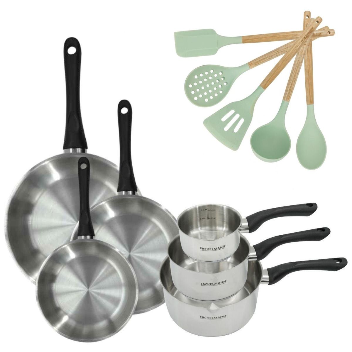 Lot de 3 poêles 20/24/28 cm en inox et 3 casseroles 12/16/20 cm Fackelmann Geneva avec 5 ustensiles