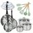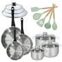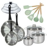 - COMPOSITION : Faitouts en acier inoxydable, poêles en inox 18/8, ustensiles en silicone et bois, tous résistants à la chaleur et faciles à entretenir.