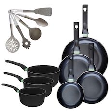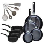 Lot de 4 Poêles 16/20/24/28 cm et 3 Casseroles 16/18/20 cm Fackelmann Brandao avec 5 ustensiles de cuisine