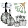 - COMPOSITION : Faitouts et poêles en acier inoxydable, ustensiles en silicone et bois, couvercles en verre résistant avec rebord inox.