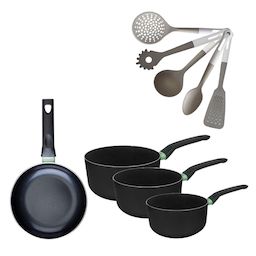 Lot Poêle 20cm & 3 Casseroles 16/18/20cm sans PFAS Fackelmann Brandao avec 5 ustensiles