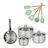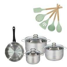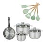 - COMPOSITION : La poêle est en acier inoxydable 18/8, tandis que les faitouts sont fabriqués en acier inoxydable de haute qualité, garantissant durabilité et performance. Les ustensiles sont en silicone et bois.