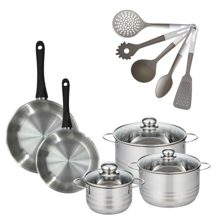 - COMPOSITION : Poêles et faitouts en acier inoxydable, ustensiles en PBT. Matériaux robustes garantissant une utilisation longue durée et sans PFAS.