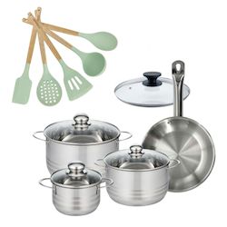 - DIMENSIONS : Poêle 24cm, faitout 16cm (1,6L), faitout 20cm (3,2L), faitout 24cm (5,4L) et 5 ustensiles de cuisine.