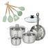 - COMPOSITION : Poêle en acier inoxydable 18/8, faitouts en acier inoxydable sans PFAS, ustensiles en silicone et bois.