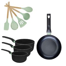 - DIMENSIONS : Poêle de 28 cm, casseroles de 16 cm, 18 cm, et 20 cm ainsi que 5 ustensiles ergonomiques de cuisine.
