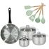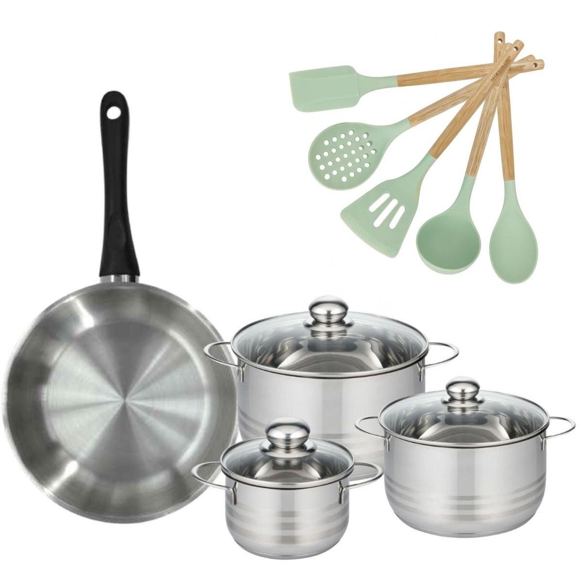 Lot Poêle 28 cm Fackelmann Généva et 3 Faitouts en acier inoxydable 16/20/24 cm et 5 ustensiles