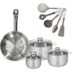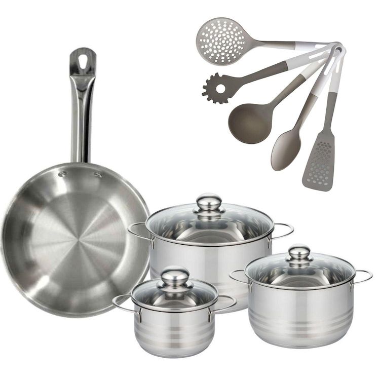 - DESCRIPTION : Ensemble Fackelmann avec poêle 28cm et trois faitouts en inox, complété par 5 ustensiles pratiques pour une cuisine polyvalente.